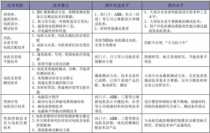 “十一五”期間,在國(guó)家實(shí)施節(jié)能減排及國(guó)務(wù)院十大產(chǎn)業(yè)調(diào)整和振興規(guī)劃的重大背景下,國(guó)家科技部對(duì)電機(jī)及系統(tǒng)節(jié)能給予了重點(diǎn)關(guān)注和支持,國(guó)家科技支持計(jì)劃“工業(yè)電機(jī)及典型泵閥節(jié)能關(guān)鍵技術(shù)研究”和863 計(jì)劃“達(dá)到IE3 標(biāo)準(zhǔn)的節(jié)能型三相異步電動(dòng)機(jī)核心技術(shù)研究”等重大項(xiàng)目的實(shí)施,使我國(guó)高校電機(jī)和變頻調(diào)速專(zhuān)用電機(jī)設(shè)計(jì)技術(shù)、電機(jī)系統(tǒng)控制技術(shù)、電機(jī)及系統(tǒng)測(cè)試技術(shù)等方面取得了一些重要的技術(shù)突破,同時(shí)通過(guò)專(zhuān)利戰(zhàn)略實(shí)施、技術(shù)標(biāo)準(zhǔn)制定等方面的工作,為自主知識(shí)產(chǎn)權(quán)的中小型電機(jī)及系統(tǒng)的產(chǎn)業(yè)化奠定了良好的基礎(chǔ)。但是實(shí)現(xiàn)產(chǎn)業(yè)化方面與國(guó)外先進(jìn)水平相比,存在電機(jī)精準(zhǔn)設(shè)計(jì)、降耗降噪、系統(tǒng)節(jié)能、系統(tǒng)測(cè)試、變頻絕緣結(jié)構(gòu)及測(cè)試、電機(jī)及控制系統(tǒng)的精心化匹配、高性能工程型矢量控制、變頻電機(jī)動(dòng)態(tài)性能測(cè)試等關(guān)鍵技術(shù)滯后的現(xiàn)象,如表1 所示。